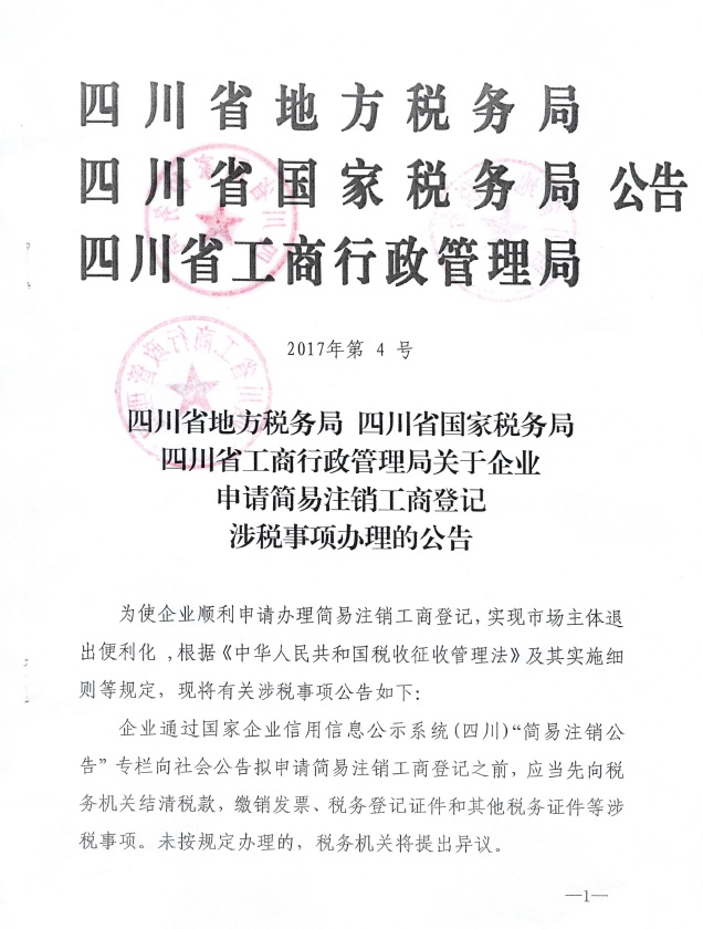 凉山彝族自治州关于企业申请简易注销工商登记涉税事项办理的公告